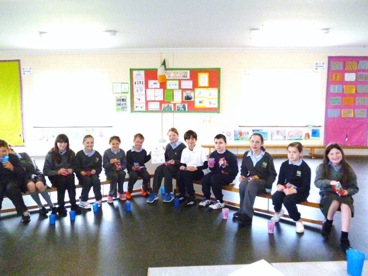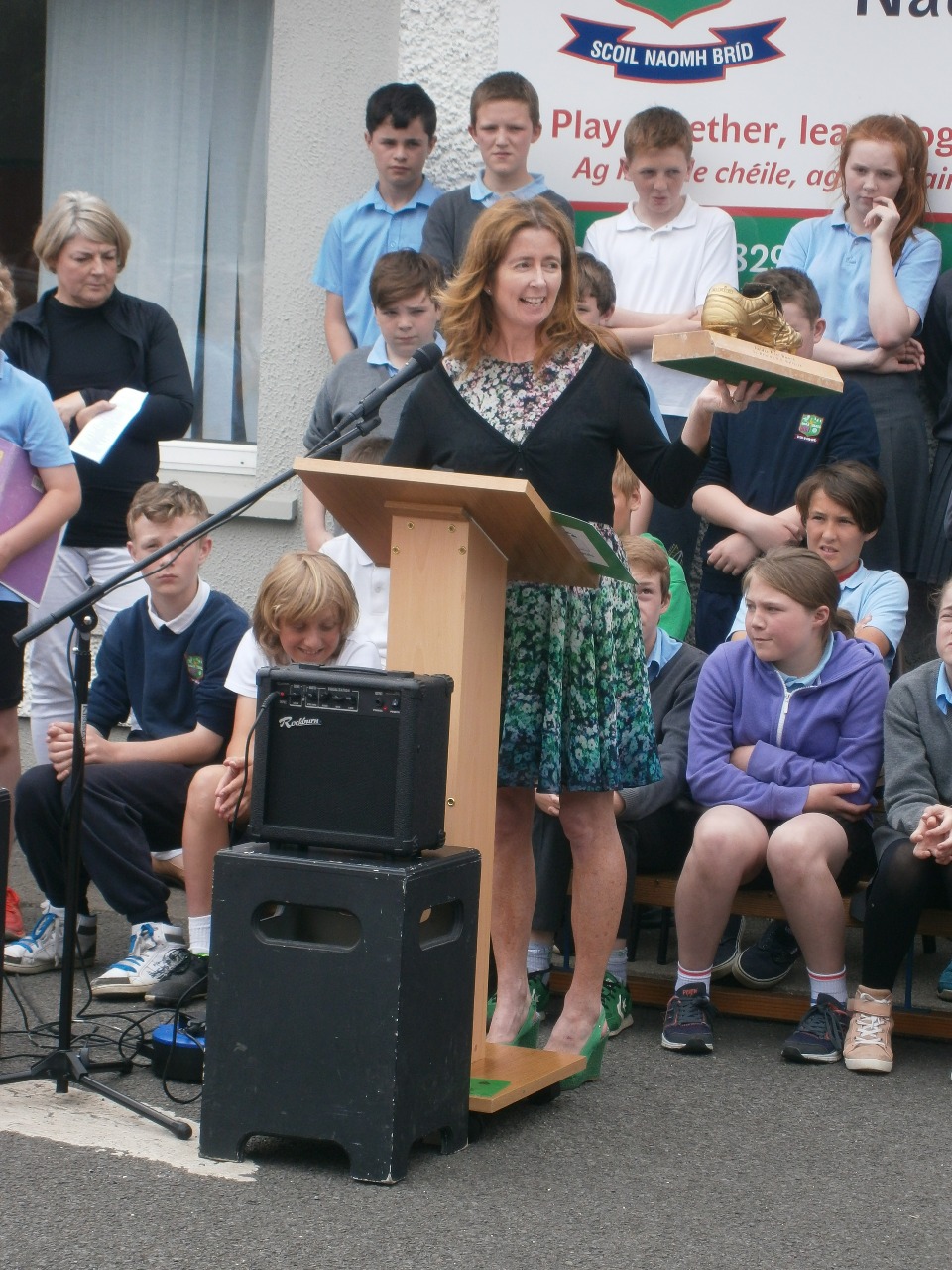 Our school has been awarded our 4th Green Flag! This is for the theme of Transport and for our promotion of "green" ways of travelling to school - walking, cycling, scooting!, getiing the bus, car-pooling and stopping the car a distance from the school and striding the rest of the way. Every week a survey is conducted in each class to see how many people came to school in a "green" way. The class with the most improved score each week is awarded The Golden Boot.